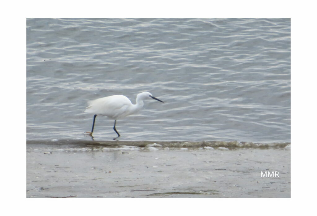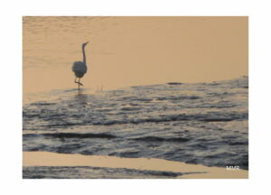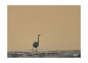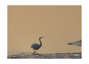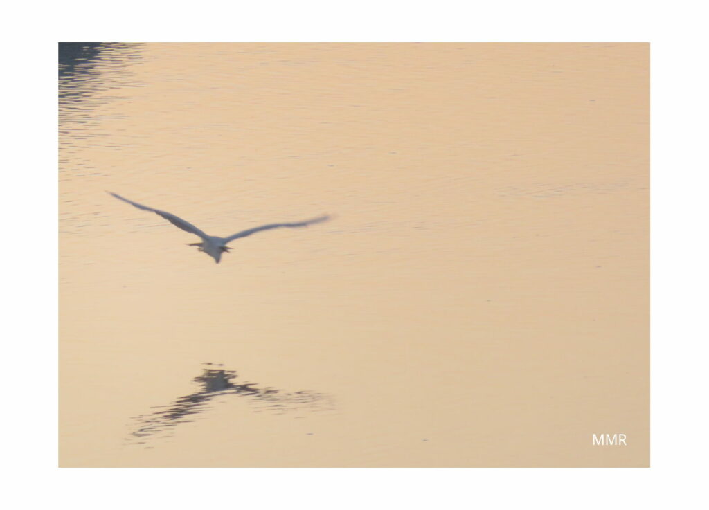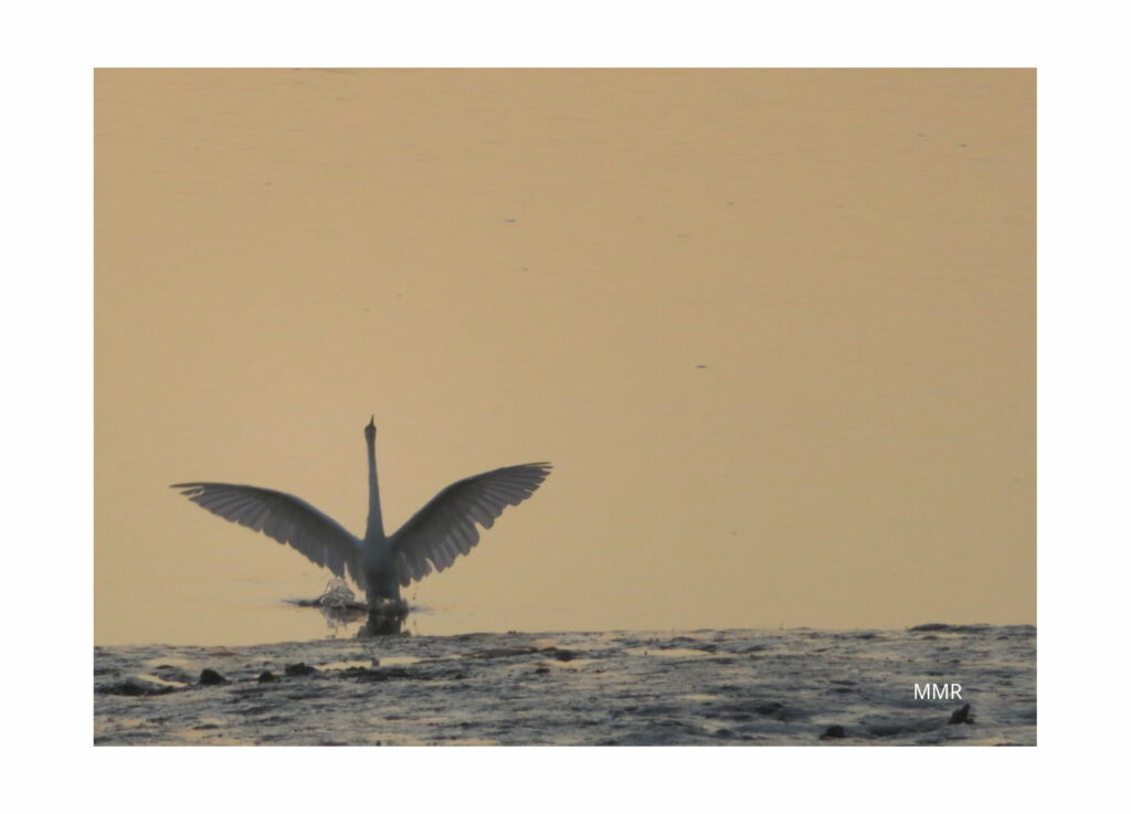 Ce matin là, en attendant le lever de Phébus, j’ai pu observer à loisir l’arrivée de ce bel oiseau. L’aigrette battit des ailes, puis longea le rivage, lentement, à pas comptés. Parfois, elle s’arrêtait, scrutant l’eau. Rien! Elle repartait donc, patiente et tenace. Lorsque soudain, sa tête plongea, rapide comme l’éclair, puis se releva, chanceuse, une petite proie dans son bec noir aussi effilé qu’un poignard.