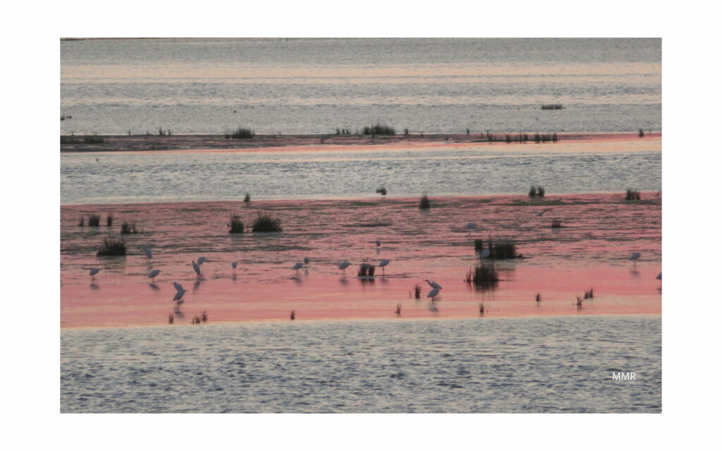 Au levant, à marée montante, les aigrettes garzette sont nombreuses à venir de se poser dans les herbiers. Beaucoup restent plantées là, comme des piquets. Parfois, ça bat un peu des ailes, peut-être le signe d’une querelle. Indifférentes, quelques unes fouillent la vase et les herbes à la recherche de petits poissons, mollusques et crustacés.