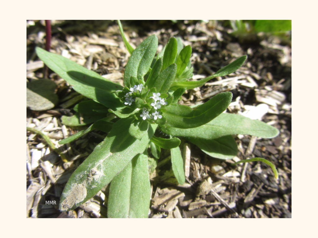 Myosotis Arventis: myosotis des champs. ( il existe plusieurs sortes de myosotis relativement semblables. J’espère ne pas m’être trompée dans l’identification de celui poussant chez moi)